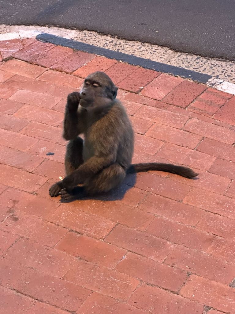 Baboons are plentiful in Simons Town these days and a band of them roamed down the street in front of the restaurant near the end of our dinner. They walked along the top of walls, on roofs, crossed at the crosswalk, and ambled down the street, unbothered by people.