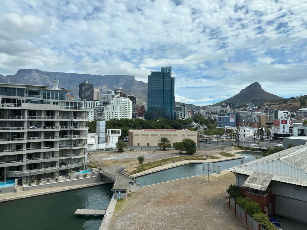 After a long but fairly uneventful journey via Amsterdam, we arrived in beautiful Cape Town late at night. We awoke to this view of the city and Table Mountain from our room. Very nice!
