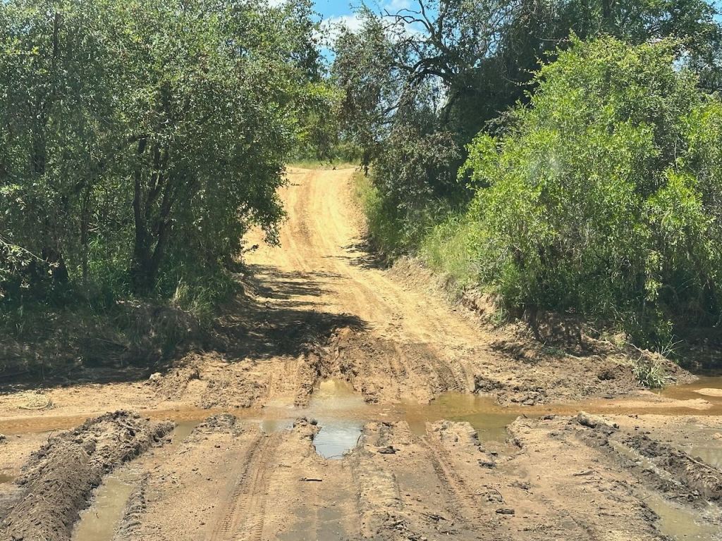 We’re staying at Shindzela, a tented camp in the Timbavati Private Nature Reserve. The general area is accessed by a hard surface main road, but to get to any of the camps, and indeed, the spotting areas, the way is on bumpy, dusty, or wet bush roads. There was a significant flooding event in the region about 3 weeks ago and some areas still haven’t recovered. This crossing has seen better days.