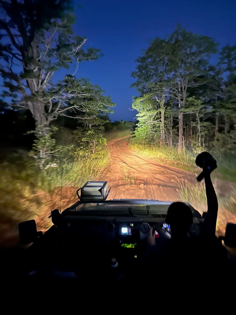 It was fun on the way back in the dark, too. The guide would scan the bushes with a flashlight, and this picked up our only sighting of a leopard on the trip – just reflections of its eyes before it scurried away into the bush.