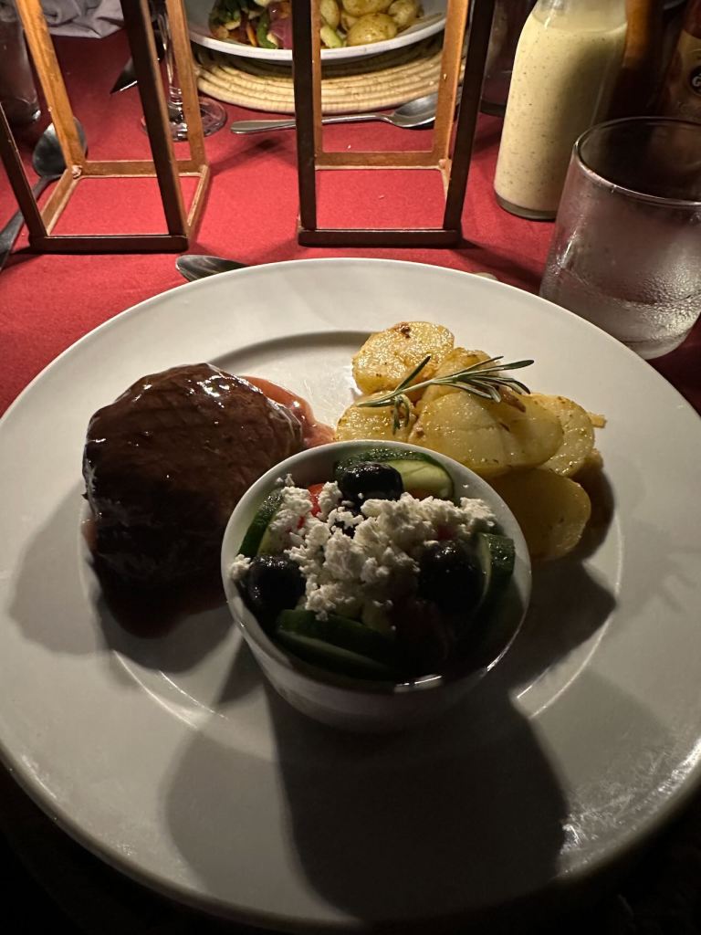The dinner offerings were mostly Western foods, except the desserts which were decidedly South African. But one night there was this ostrich steak, which was quite good. Similar to a beef steak but much leaner.