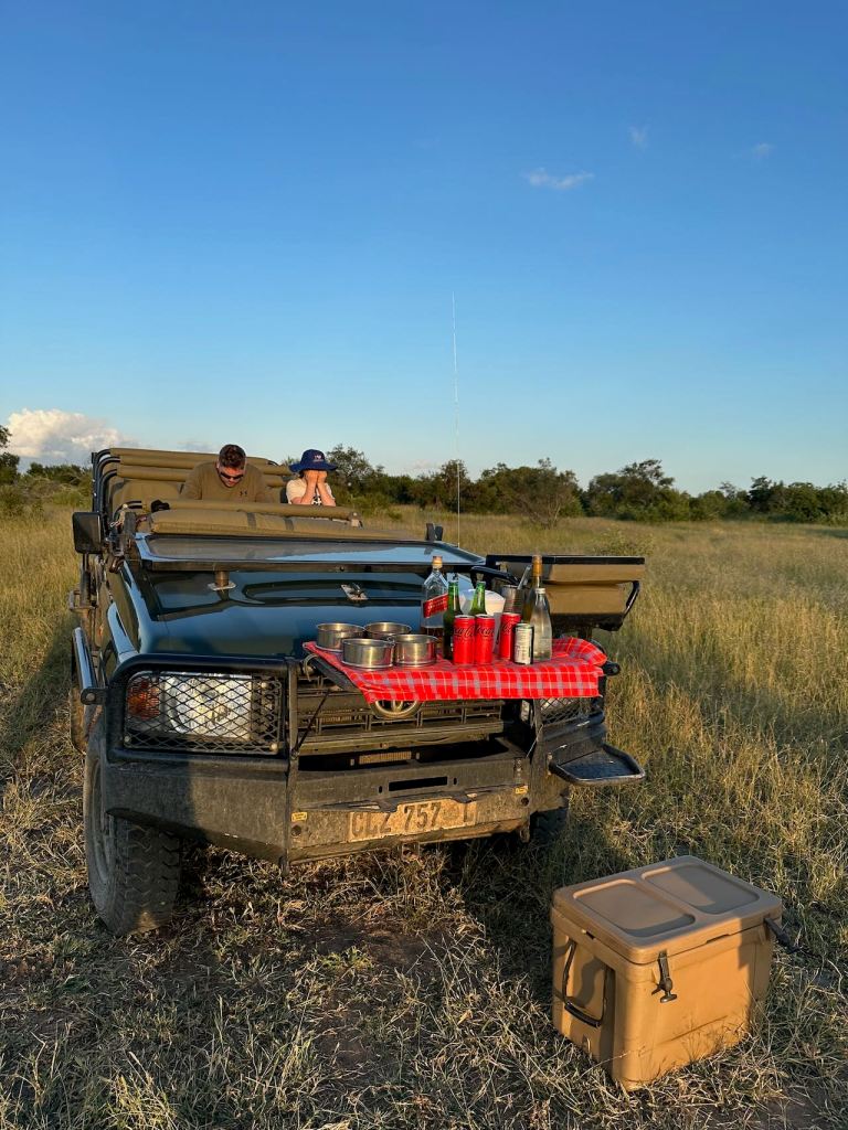Around 6:00 PM we’d stop for a Sundowner drink and snack in the bush, somewhere with a nice view of the African sun lowering in the sky. You could pre-order any drink you wanted from the bar and it was all brought out in a cooler. And most of the time we’d stop at a spot that had one or two bars of mobile phone service, which proved to be quite useful as the camp internet went down for 2.5 days the next morning.