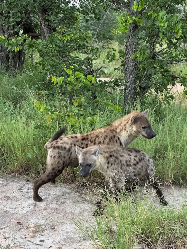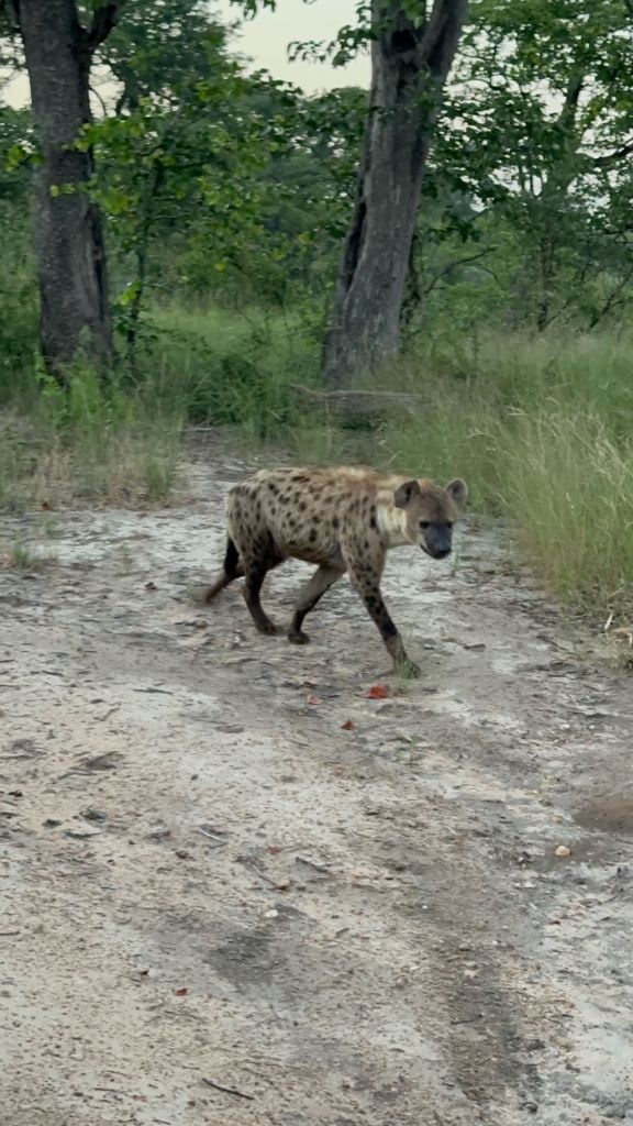 Morning game drives began with a 5:00 am wakeup knock. We’d set off at 5:30. It was much cooler in the mornings and most of us wore long sleeves, pants, or maybe a blanket in the wind. A couple of the mornings we saw hyenas very, very close to the camp gate – the last morning there were a pair of them just a few metres away.