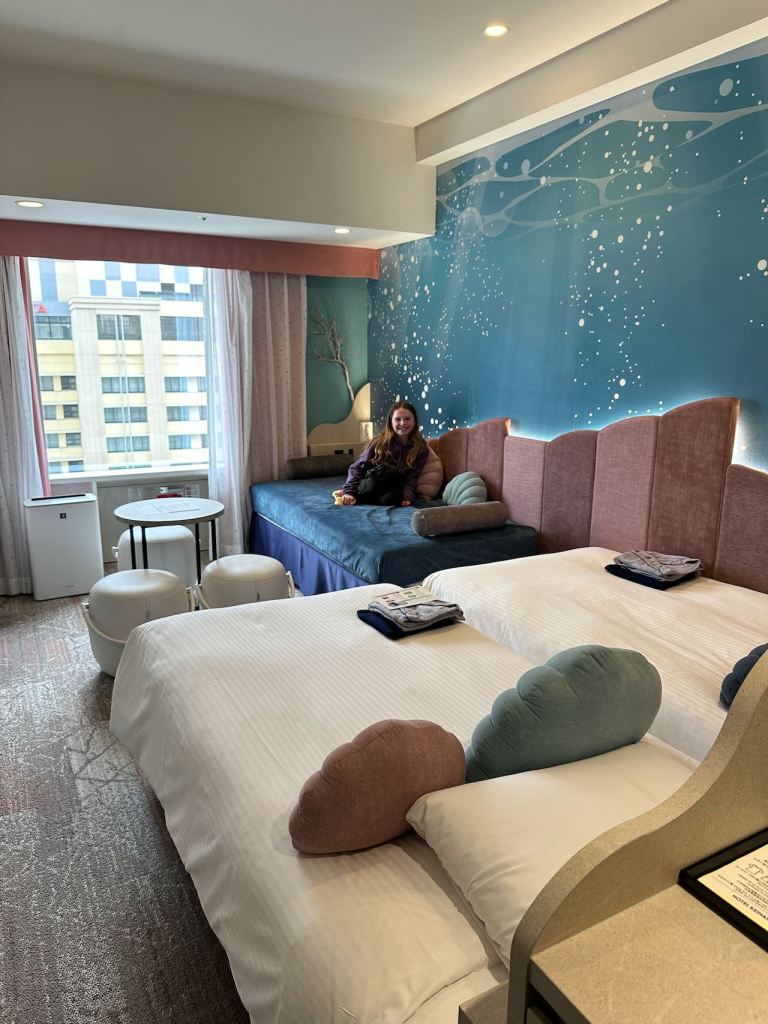 On a rainy afternoon, we arrived at our hotel – somehow we managed to get a room for 3 with a sofa bed on the side. Someone was pretty pleased about that arrangement.