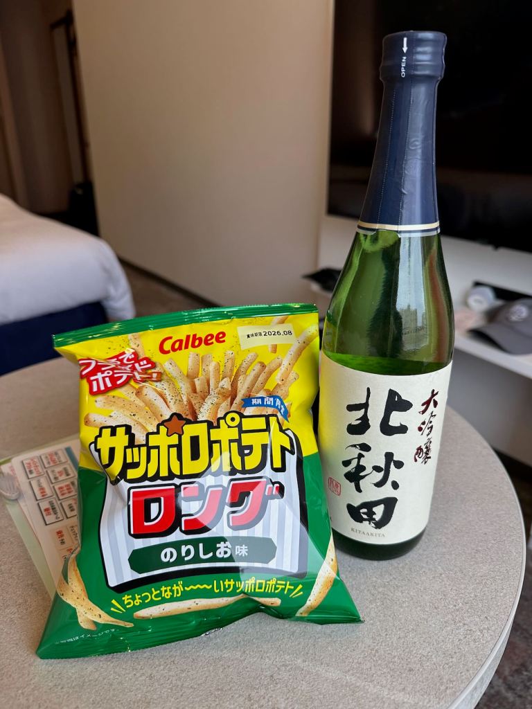 I got a little snack from the Lawson store downstairs. Sake, yum!