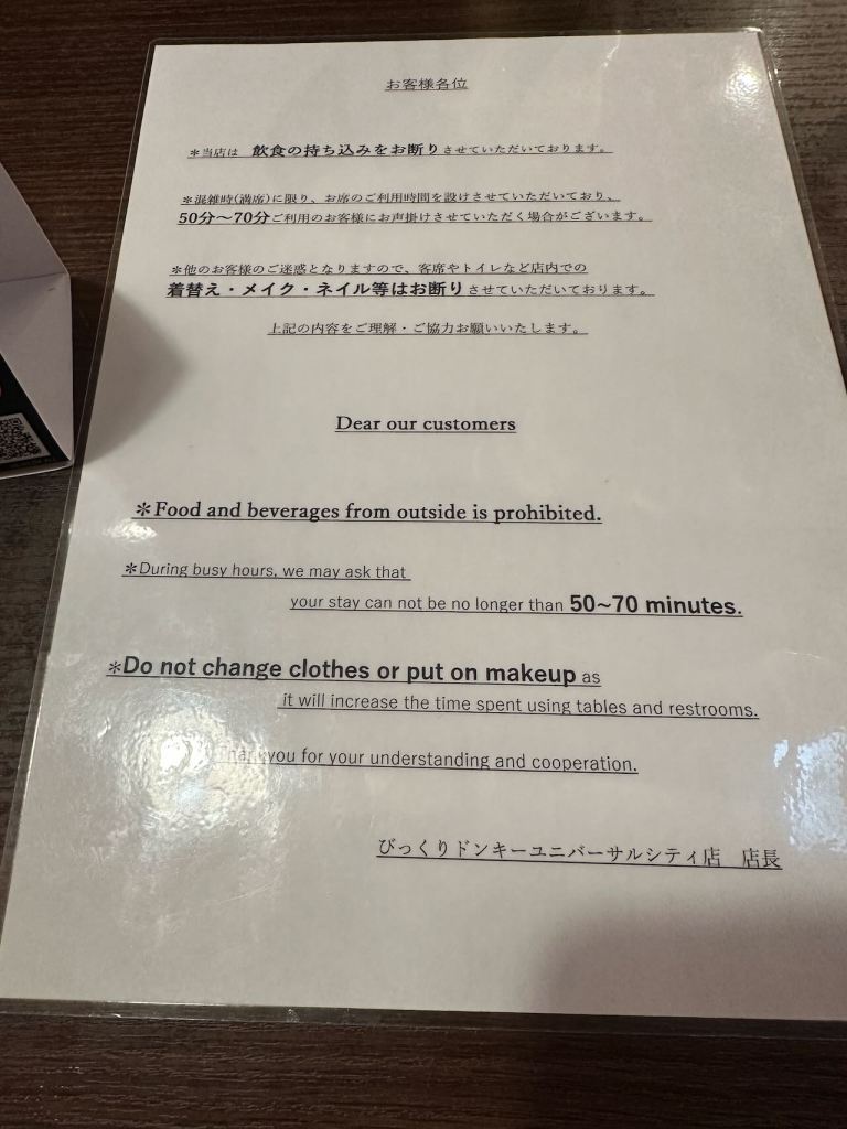 Who changes clothes or puts on makeup in Bikkuri Donkey?! (This sign was on the table by the menus)