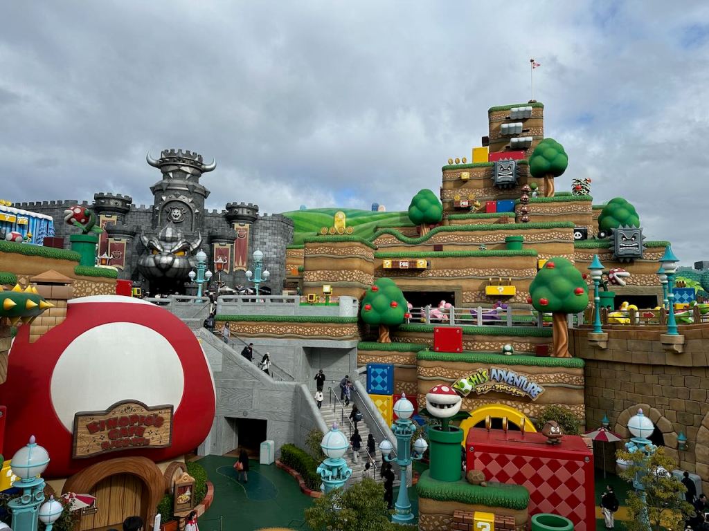 The rain stopped overnight as promised and we were up early to line up at Universal Studios Japan an hour before opening. It’s the only way that we could get a chance of visiting the Super Nintendo World area of the park, which is extremely popular and was the venue on the trip that Dicky’s son, Frederick, was most excited about. So we couldn’t miss it by sleeping in. You could guarantee entry to Super Nintendo World and skip the line on certain rides by purchasing express passes in advance, but we initially waffled on it as they weren’t’ cheap and you had to buy set groups of rides, not pick your own, and then by the time I reconsidered it was too late as they were sold out for our day.
