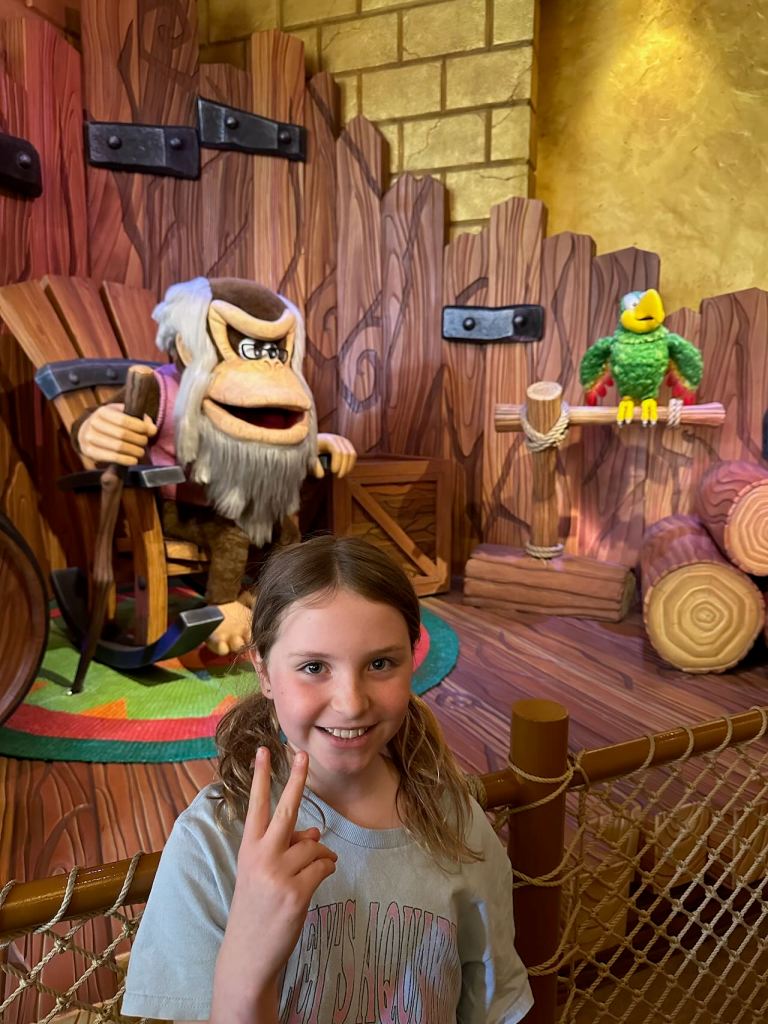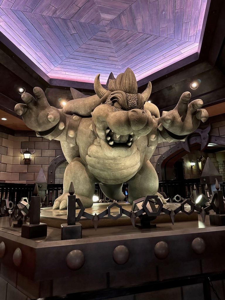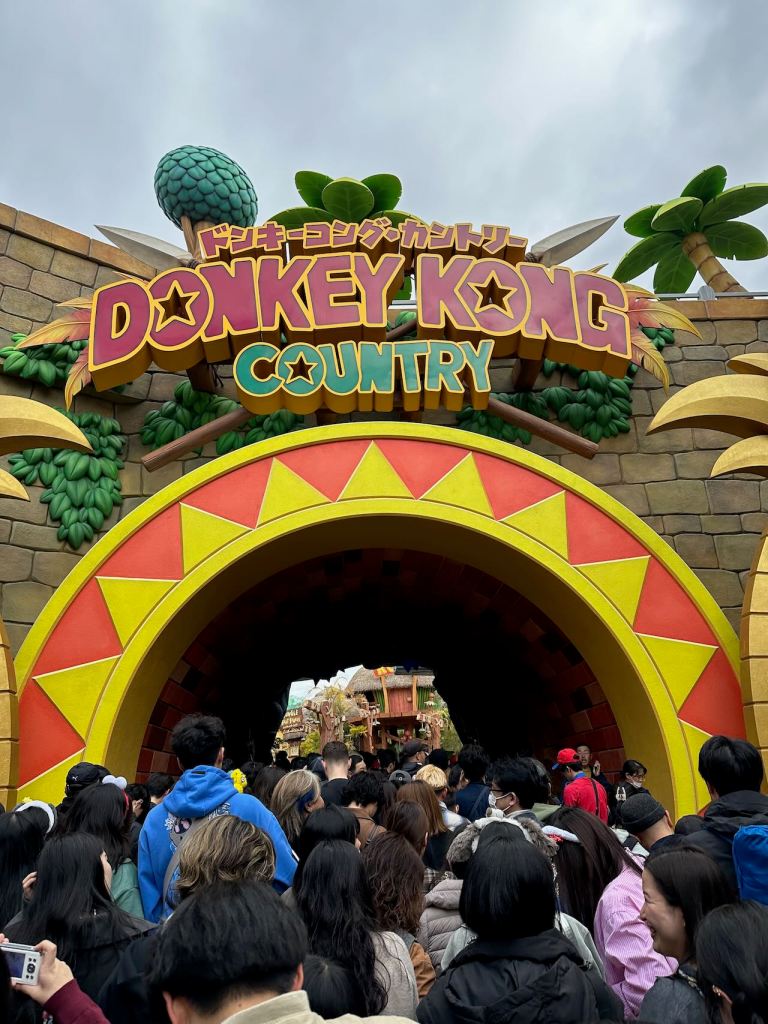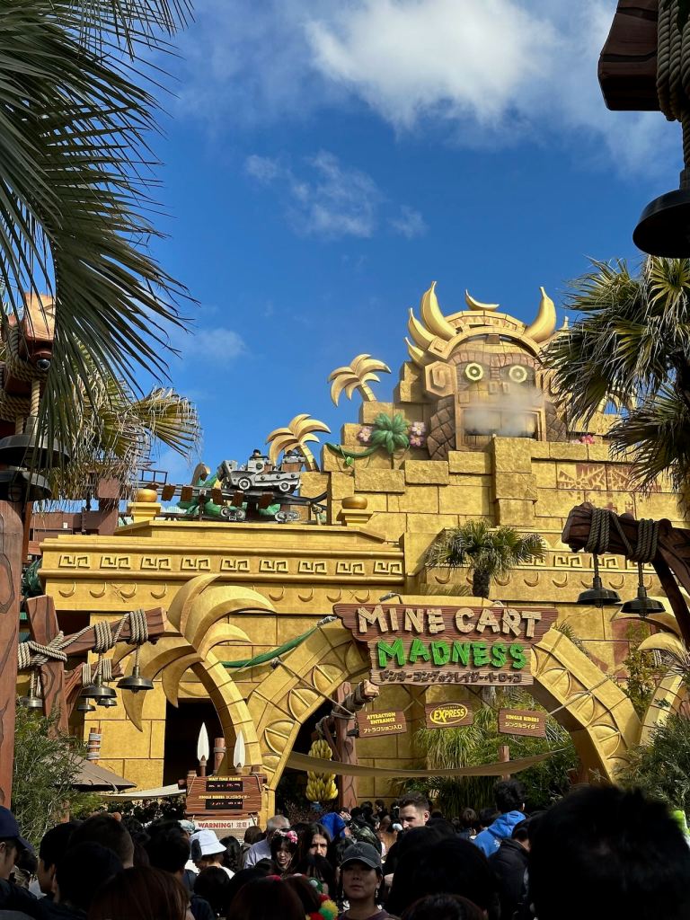 Well, thankfully we made it to Super Nintendo World by walking quickly, before they closed the gates and implemented the timed entry scheme. It was busy already though. We went to hit one of the most popular rides in the park first, in Donkey Kong Country: Minecart Madness. We didn’t realize how long the line was until we’d already invested about half an hour waiting in line.