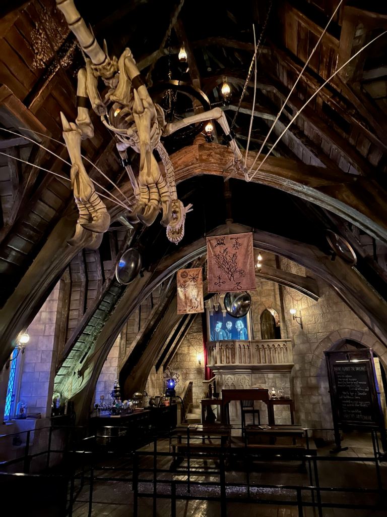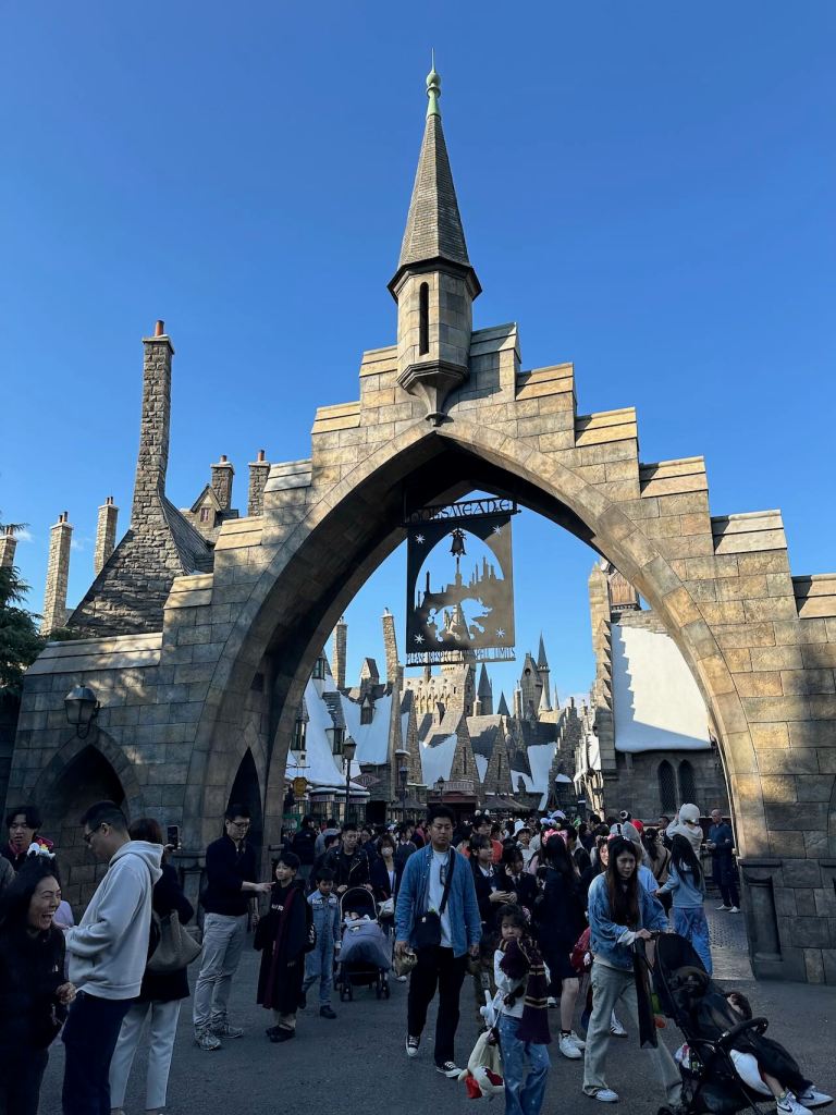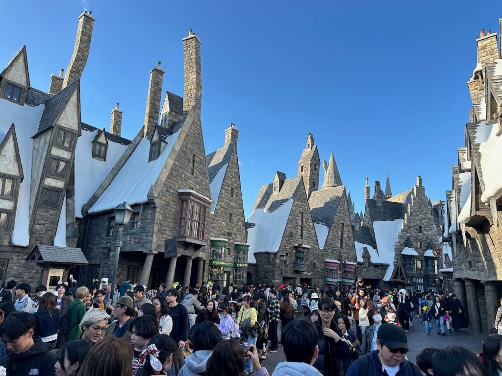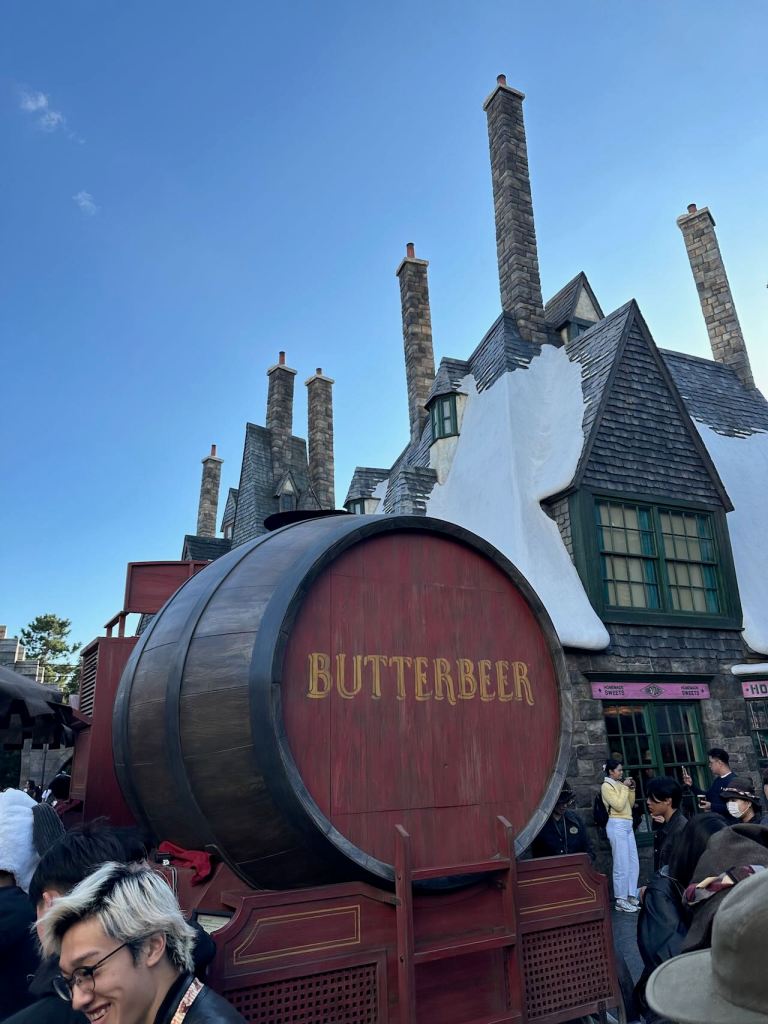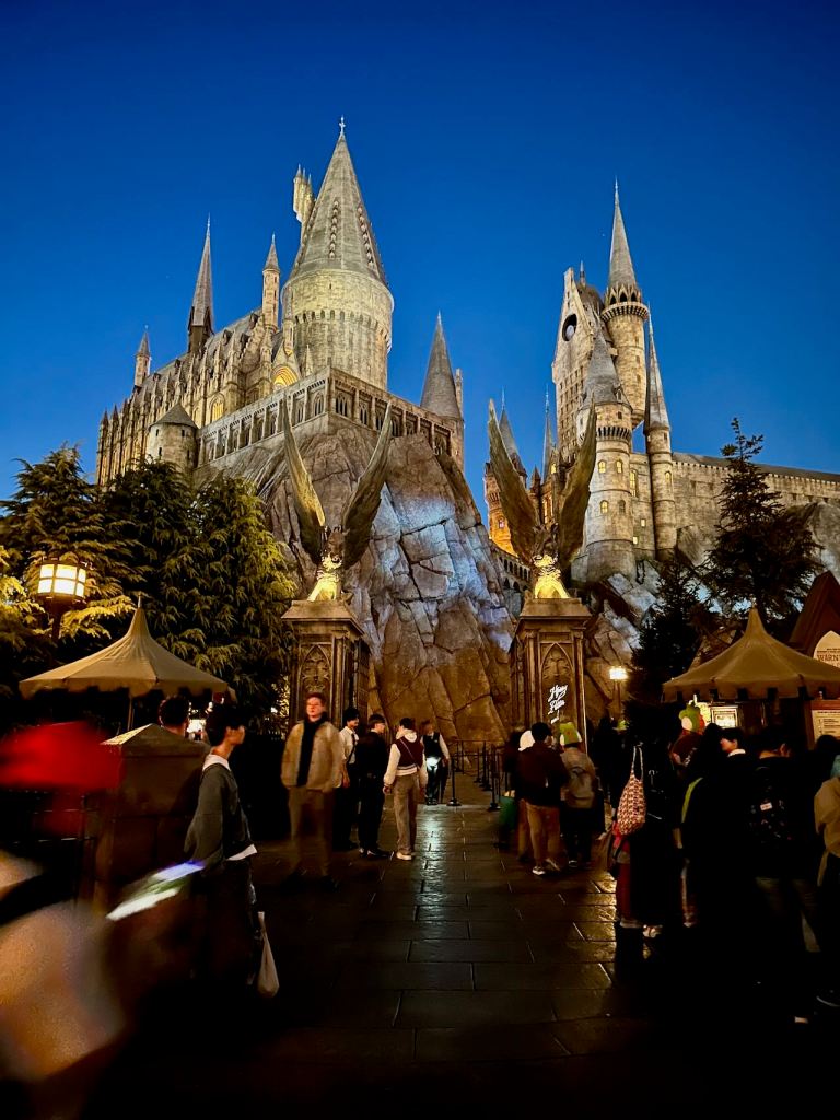 Ellie, Charlotte and I did some exploring around on a few of the more tame rides and then lined up for another long one – the Harry Potter Forbidden Journey, which was displaying a 2 hour wait time. The village of Hogsmeade and Hogwarts Castle outside the ride was well done, and again, would look even better at night.